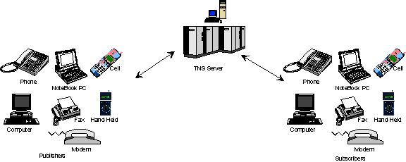 Titus Notification Service (TNS) is a universal notification service that allows for the publication of and subscription to events. Events may be public or private. They are accessed and delivered via any networked device. Once an event is published, subscribers may request to be notified of the occurrence of these events. Events may be based on user-defined criteria, including time and location. When the event occurs, they will be notified via any networked device they have at their disposal (e.g., cell, fax, Palm Pilot, pager, web, email, computer, etc.).