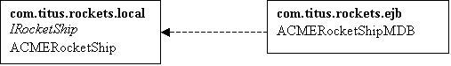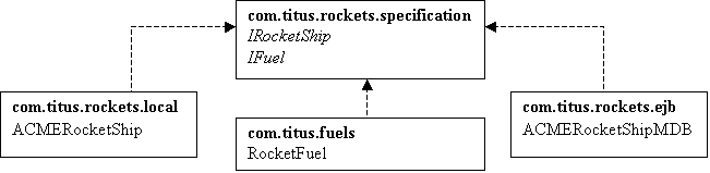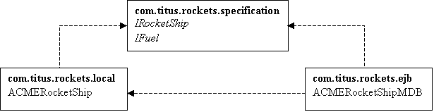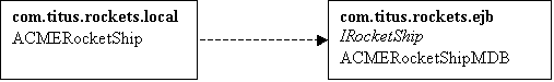 This almost solves the problem, but not quite. Unless we logically and physically separate the implementations from the specification, clients and servers will be needlessly bound. Why? Imagine that our client code wants to use the IRocketShip interface. Being excellent client programmers, they program to the interface, not the class. Suppose the IRocketShip interface resides in the com.titus.rockets.local package. The com.titus.rockets.ejb package is now dependent on the com.titus.rockets.local package because the interface resides in the local package (see Figure 1).