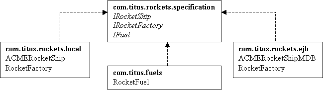 This diagram says that anytime the com.titus.rockets.ejb segment is deployed, the com.titus.rockets.local and the com.titus.rockets.specification segments must also be deployed. However if com.titus.rockets.local is deployed, com.titus.rockets.specification must be deployed, but not com.titus.rockets.ejb. In this case, that’s exactly what is desired.